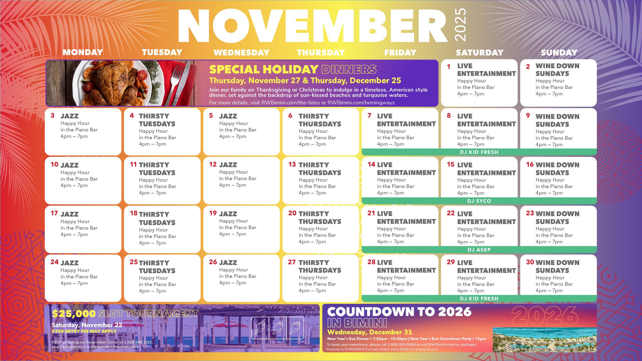 The Resorts World Bimini Casino has non-stop action happening year-round. Try your luck with a variety of popular live table games and your favorite slot machines.