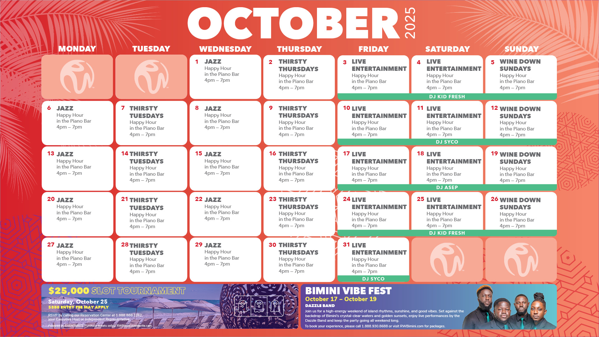 The Resorts World Bimini Casino has non-stop action happening year-round. Try your luck with a variety of popular live table games and your favorite slot machines.